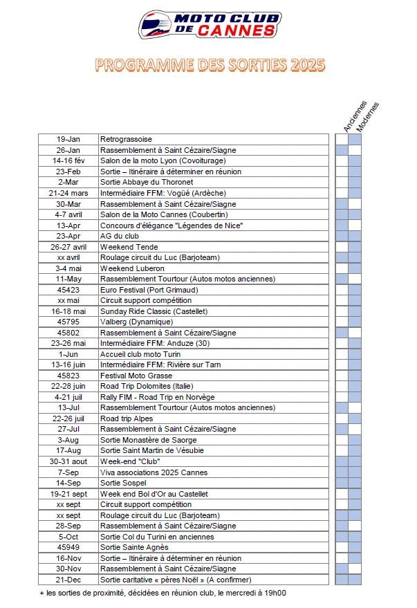 Voici le calendrier prévisionnel des principales sorties 2025 du Moto Club. Petites balades du dimanche, week-ends, voyages, rassemblements, il reflète la diversité du monde motard car le club s'adresse à tous les profils.